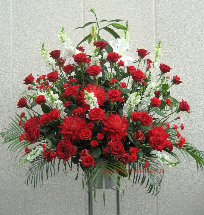 ☆赤薔薇・ガーベラなどの赤の花で仕上げた赤鮮やかなスタンド花です。