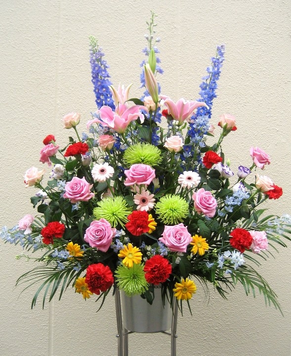☆お花の種類はおまかせの、ユリ・バラ・ガーベラなどを入れて華やかな色合いの花で仕上げた華やかなスタンド花です。